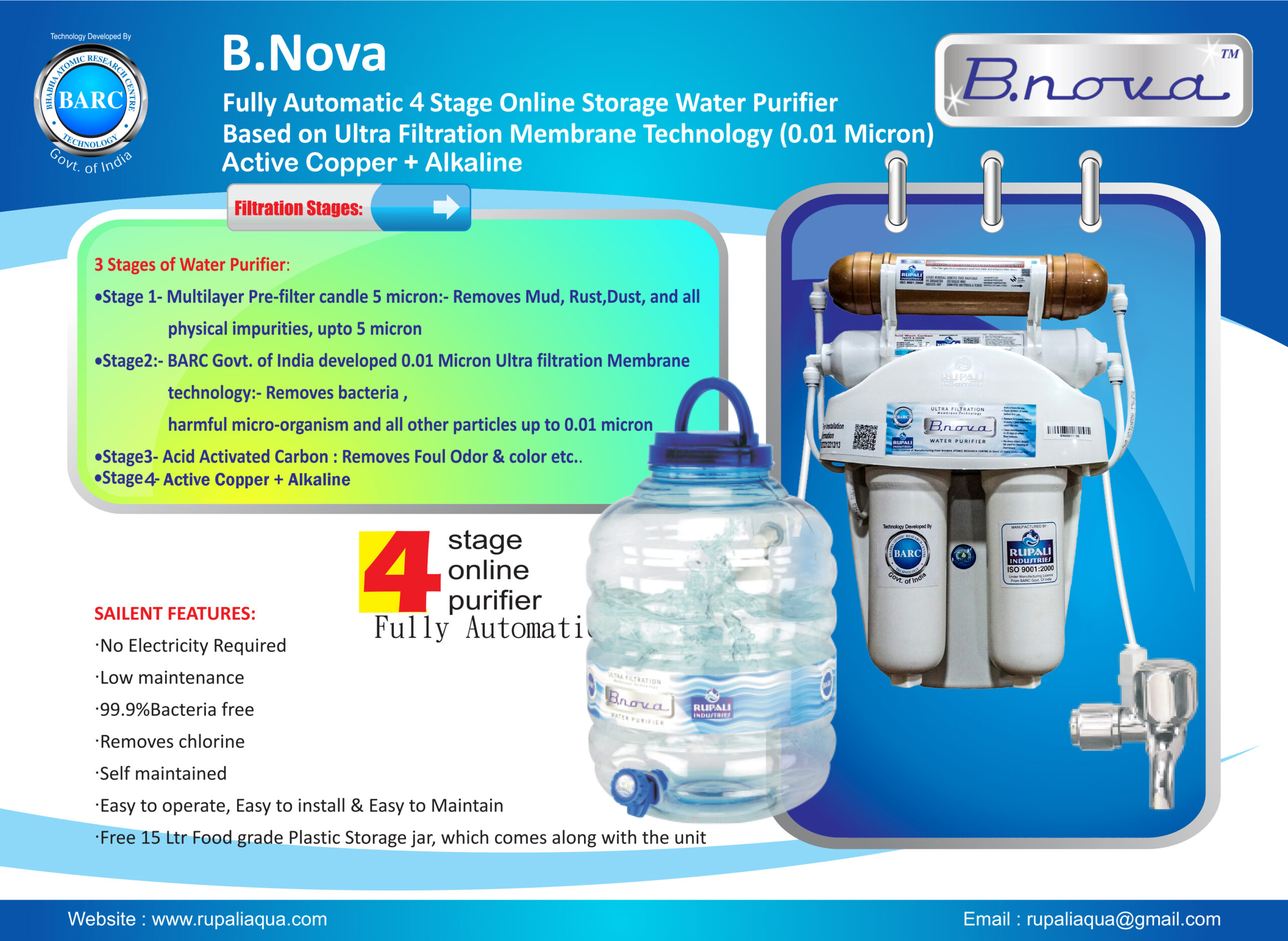 Based on Ultra Filtration Membrane Technology 0.01 Micron developed by BARC Govt. of India